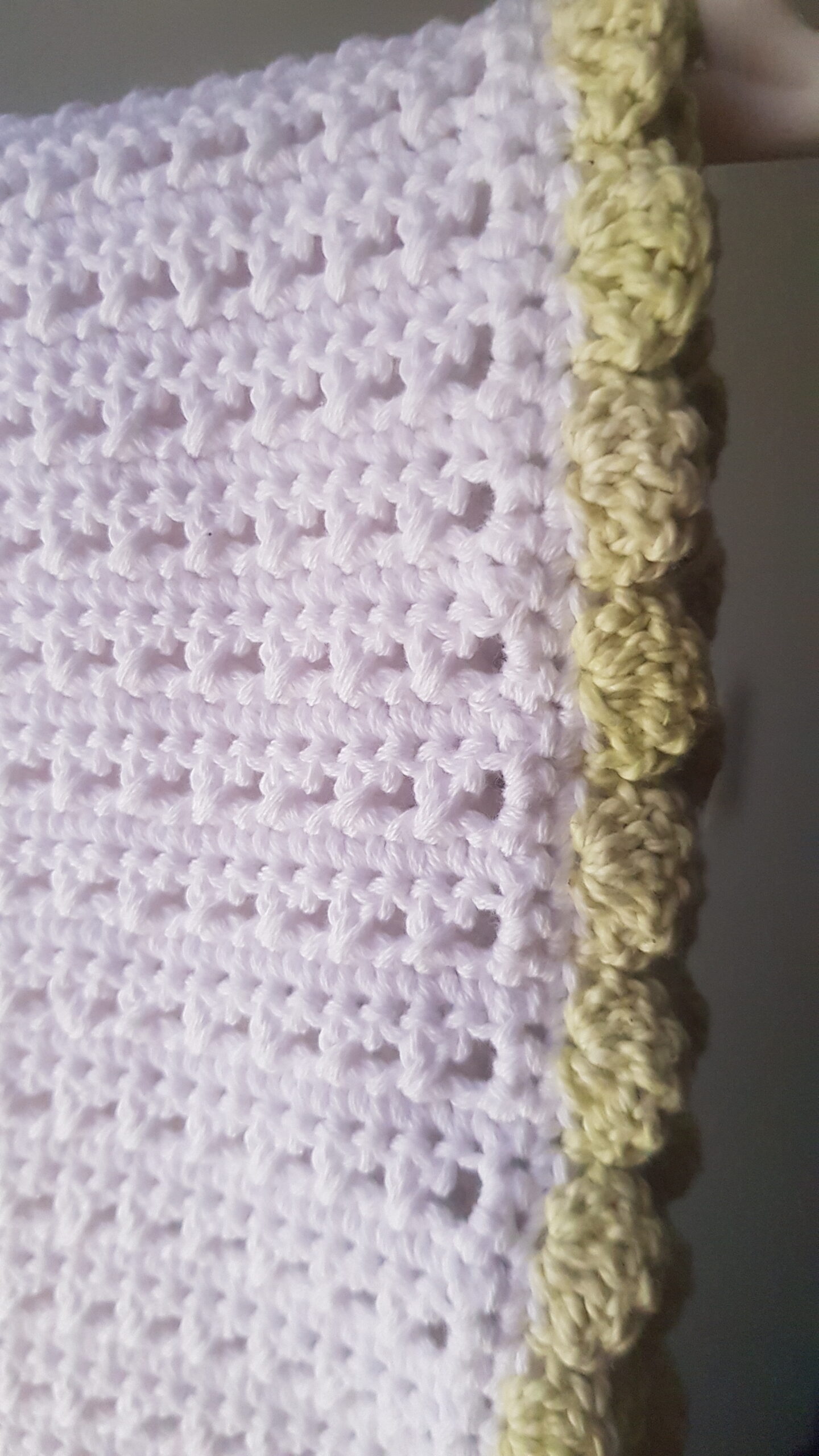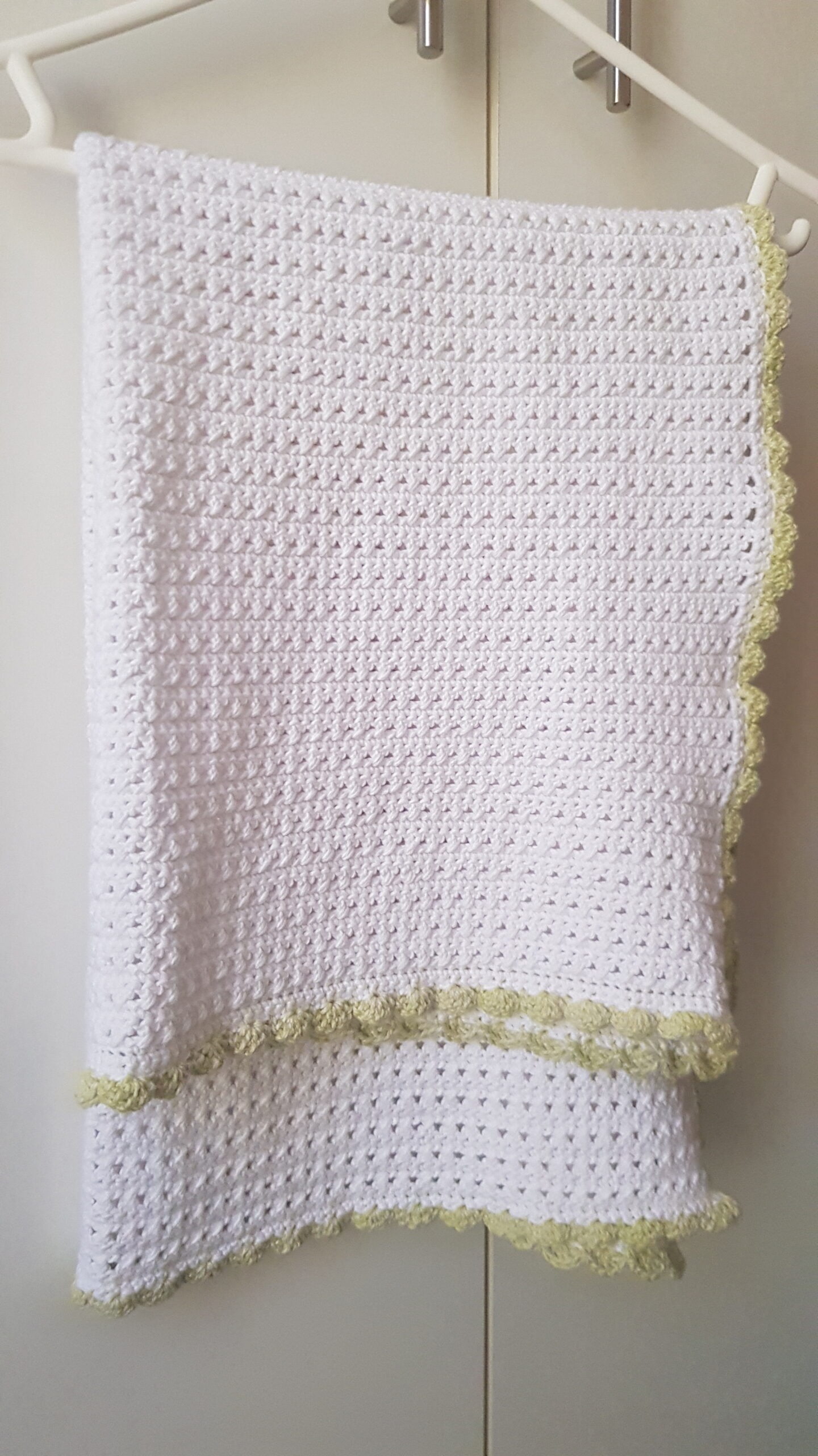 Crocheted by hand using only 100% cotton yarn. Pear and white colour. Cross stitch and shell stitch border blessing blanket. Perfect size to carry around and to use as a car seat blanket. Light weight and breathable, best for baby’s skin.